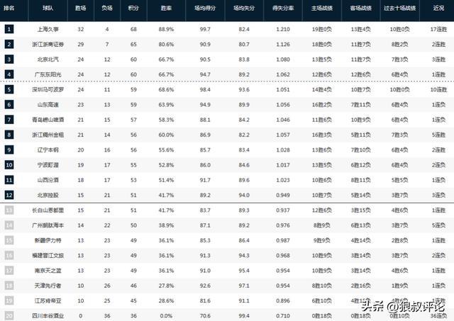CBA排名:上海稳居第一 四队争前4白热化 季后赛尾班车名额最惨烈